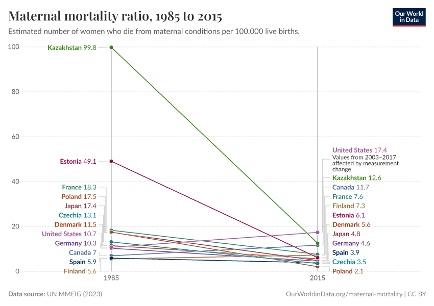 “Data Page: Maternal mortality ratio”, part of the following publication: Max Roser and Hannah Ritchie (2013) - “Maternal Mortality”. Data adapted from UN MMEIG (WHO, UNICEF, UNFPA, World Bank Group and UNDESA/ Population Division). Retrieved from https://search-refactor-react-query.owid.pages.dev/grapher/maternal-mortality-slope-chart [online resource]