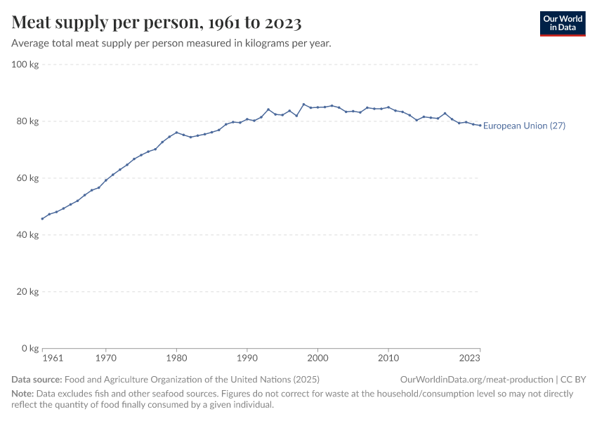 Food and Agriculture Organization of the United Nations (2024) – processed by Our World in Data. “Yearly per capita supply of all meat” [dataset]. Food and Agriculture Organization of the United Nations, “Food Balances: Food Balances (-2013, old methodology and population)”; Food and Agriculture Organization of the United Nations, “Food Balances: Food Balances (2010-)” [original data]. Retrieved September 17, 2025 from https://search-refactor-react-query.owid.pages.dev/grapher/meat-supply-per-person