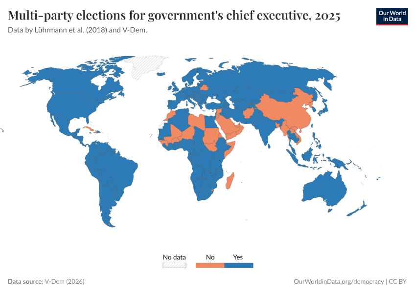V-Dem (2025) – processed by Our World in Data. “Multi-party elections for government's chief executive – V-Dem” [dataset]. V-Dem, “Democracy report v15” [original data]. Retrieved September 17, 2025 from https://search-refactor-react-query.owid.pages.dev/grapher/multi-party-elections-hoe-row