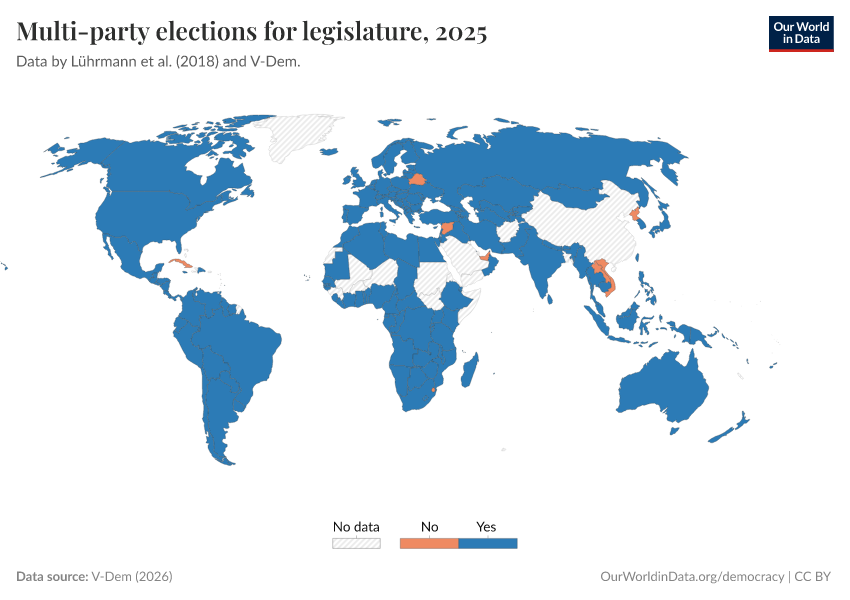 “Data Page: Multiparty elections for legislature”, part of the following publication: Bastian Herre, Lucas Rodés-Guirao, and Esteban Ortiz-Ospina (2013) - “Democracy”. Data adapted from V-Dem. Retrieved from https://search-refactor-react-query.owid.pages.dev/grapher/multi-party-elections-legislature-row [online resource]How to cite this data