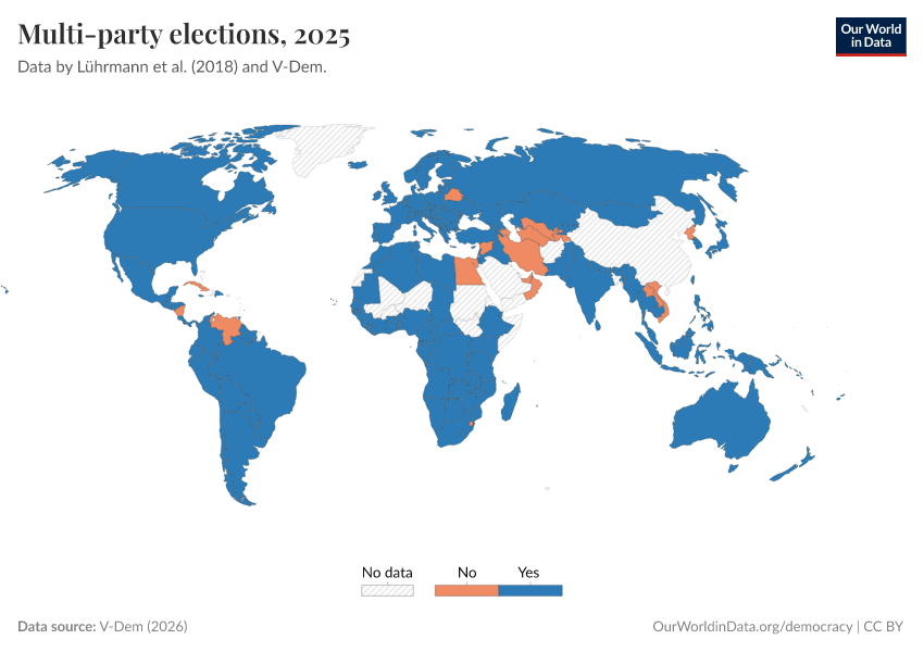 “Data Page: Multiparty elections”, part of the following publication: Bastian Herre, Lucas Rodés-Guirao, and Esteban Ortiz-Ospina (2013) - “Democracy”. Data adapted from V-Dem. Retrieved from https://search-refactor-react-query.owid.pages.dev/grapher/multi-party-elections-row [online resource]How to cite this data