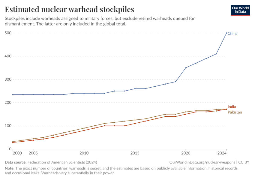 Federation of American Scientists (2023) – with minor processing by Our World in Data. “Estimated nuclear warhead stockpiles” [dataset]. Federation of American Scientists, “Estimated Global Nuclear Warhead Inventories” [original data]. Retrieved September 17, 2025 from https://search-refactor-react-query.owid.pages.dev/grapher/nuclear-warhead-stockpiles-lines