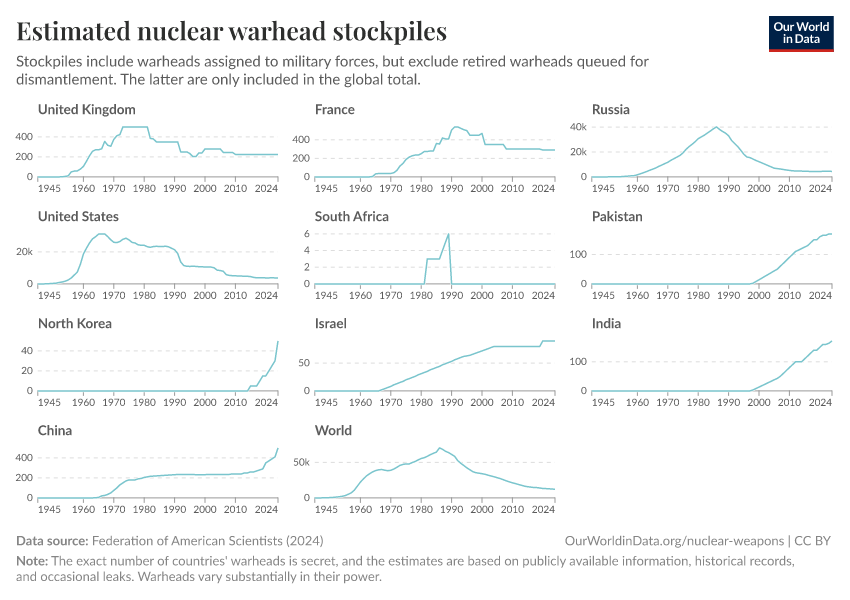 Federation of American Scientists (2023) – with minor processing by Our World in Data. “Estimated nuclear warhead stockpiles” [dataset]. Federation of American Scientists, “Estimated Global Nuclear Warhead Inventories” [original data]. Retrieved September 17, 2025 from https://search-refactor-react-query.owid.pages.dev/grapher/nuclear-warhead-stockpiles-lines