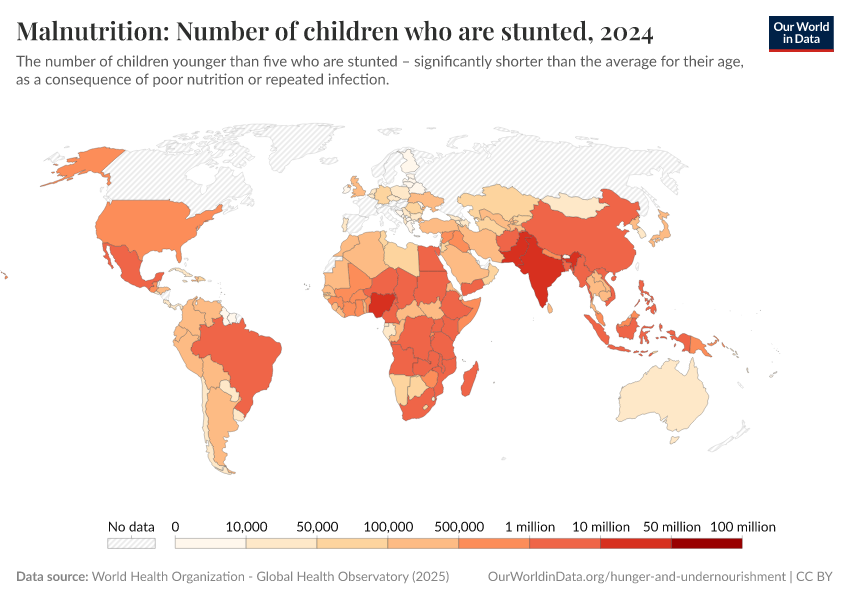 World Health Organization - Global Health Observatory (2024) – processed by Our World in Data. “Malnutrition: Number of children who are stunted” [dataset]. World Health Organization, “Global Health Observatory” [original data]. Retrieved September 17, 2025 from https://search-refactor-react-query.owid.pages.dev/grapher/number-children-stunted-who