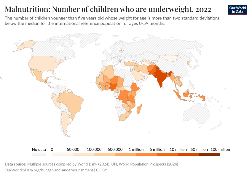 “Data Page: Number of underweight children”. Our World in Data (2025). Data adapted from UNICEF, WHO, World Bank, United Nations. Retrieved from https://search-refactor-react-query.owid.pages.dev/grapher/number-of-children-who-are-underweight [online resource]How to cite this data