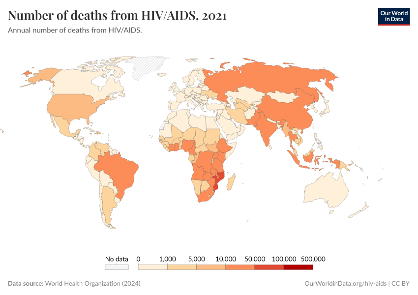 World Health Organization (2024) – with major processing by Our World in Data. “Number of deaths from HIV/AIDS” [dataset]. World Health Organization, “Global Health Estimates” [original data]. Retrieved September 17, 2025 from https://search-refactor-react-query.owid.pages.dev/grapher/number-of-deaths-from-hivaids-who