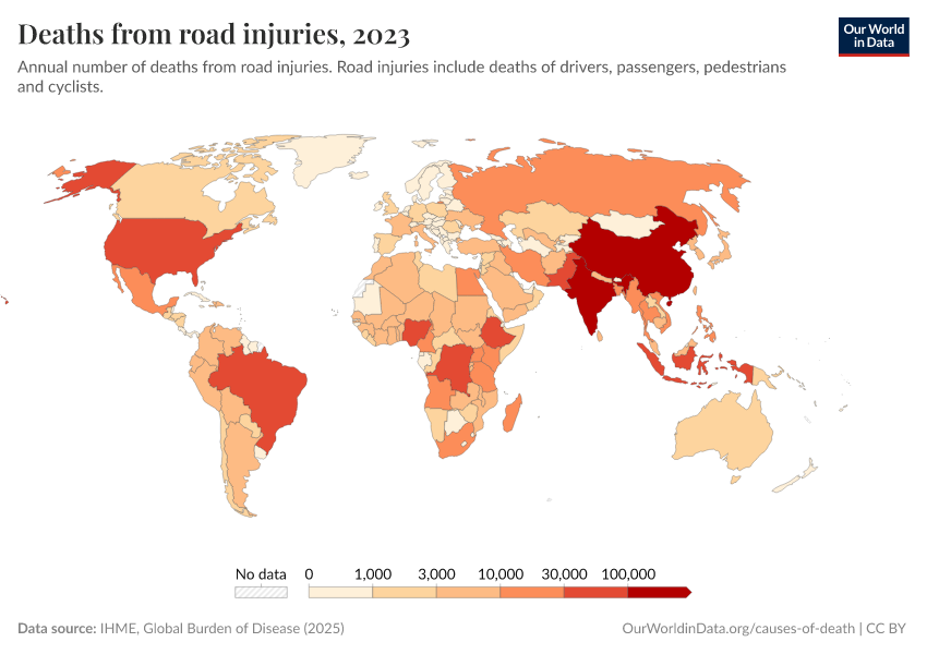 IHME, Global Burden of Disease (2024) – with minor processing by Our World in Data. “Deaths from road injuries” [dataset]. IHME, Global Burden of Disease, “Global Burden of Disease - Deaths and DALYs” [original data]. Retrieved September 17, 2025 from https://search-refactor-react-query.owid.pages.dev/grapher/number-of-deaths-from-road-injuries