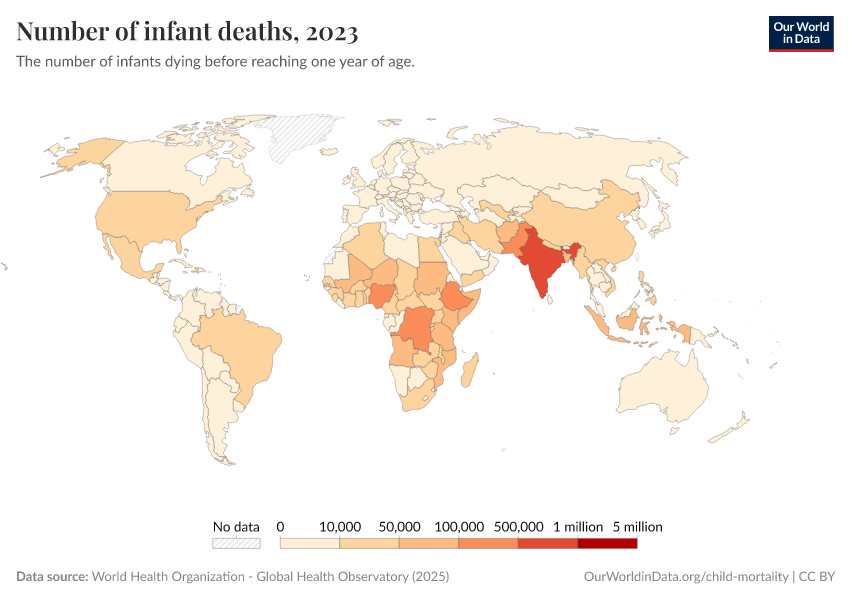 “Data Page: Number of infant deaths”. Our World in Data (2025). Data adapted from World Health Organization. Retrieved from https://search-refactor-react-query.owid.pages.dev/grapher/number-of-infant-deaths-gho [online resource]How to cite this data