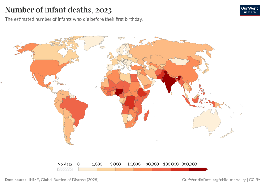 IHME, Global Burden of Disease (2024) – with minor processing by Our World in Data. “Number of infant deaths” [dataset]. IHME, Global Burden of Disease, “Global Burden of Disease - Child Mortality” [original data]. Retrieved September 17, 2025 from https://search-refactor-react-query.owid.pages.dev/grapher/number-of-infant-deaths-ihme