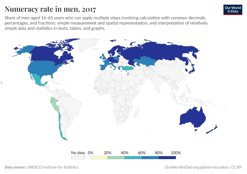 “Data Page: Numeracy rate in men”. Our World in Data (2025). Data adapted from UNESCO Institute for Statistics. Retrieved from https://search-refactor-react-query.owid.pages.dev/grapher/numeracy-rate-in-adult-men [online resource]How to cite this data