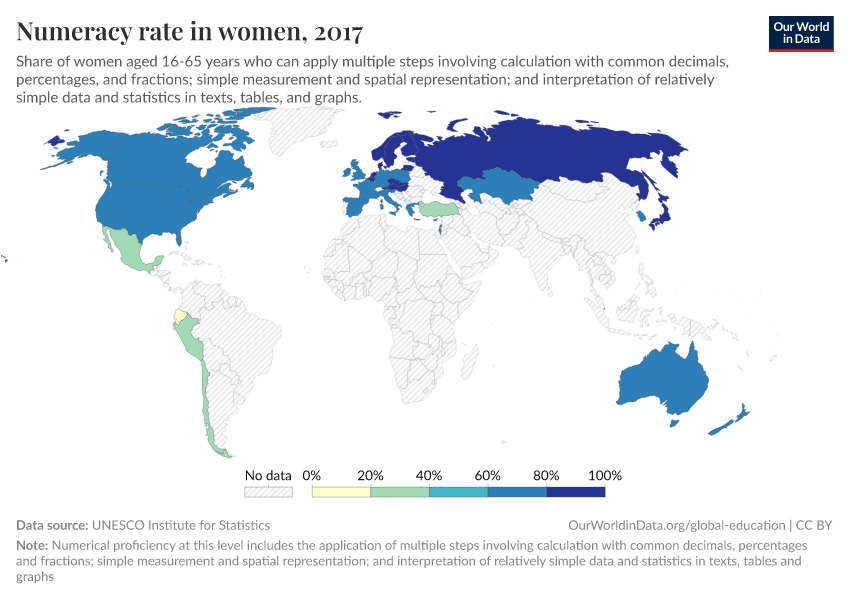 “Data Page: Numeracy rate in women”. Our World in Data (2025). Data adapted from UNESCO Institute for Statistics. Retrieved from https://search-refactor-react-query.owid.pages.dev/grapher/numeracy-rate-in-adult-women-sdg [online resource]How to cite this data