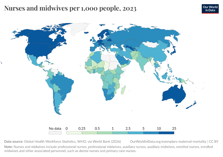 World Health Organization and OECD, via World Bank (2025) – processed by Our World in Data. “Nurses and midwives per 1,000 people” [dataset]. World Health Organization and OECD, via World Bank, “World Development Indicators” [original data]. Retrieved September 17, 2025 from https://search-refactor-react-query.owid.pages.dev/grapher/nurses-and-midwives-per-1000-people