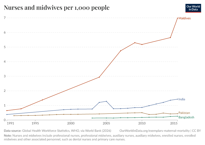 World Health Organization and OECD, via World Bank (2025) – processed by Our World in Data. “Nurses and midwives per 1,000 people” [dataset]. World Health Organization and OECD, via World Bank, “World Development Indicators” [original data]. Retrieved September 17, 2025 from https://search-refactor-react-query.owid.pages.dev/grapher/nurses-and-midwives-per-1000-people