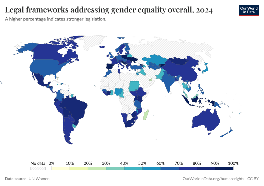 “Data Page: Legal frameworks addressing gender equality overall”. Our World in Data (2025). Data adapted from UN Women. Retrieved from https://search-refactor-react-query.owid.pages.dev/grapher/overarching-legal-frameworks-regarding-gender-equality [online resource]How to cite this data