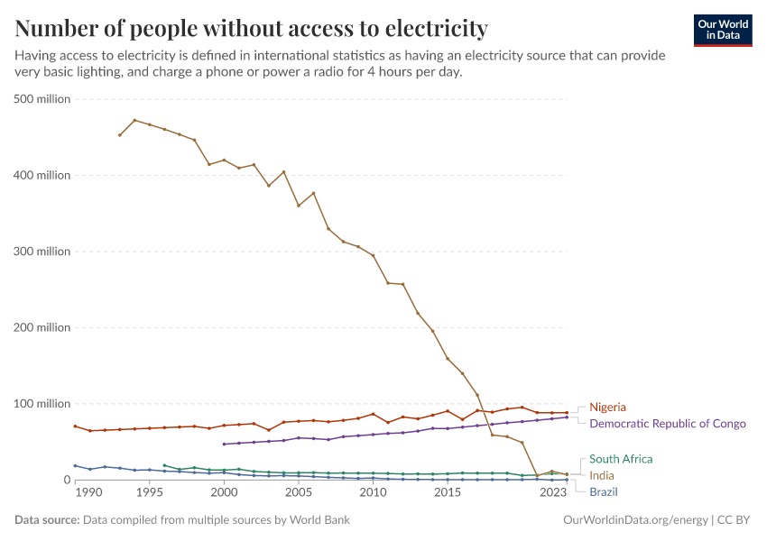 Data compiled from multiple sources by World Bank – with major processing by Our World in Data. “Number of people without access to electricity – World Bank” [dataset]. IEA, IRENA, UNSD, WHO, and World Bank, “World Development Indicators”; United Nations Population Division, Eurostat, national statistical offices, and United Nations Statistics Division, via World Bank, “World Development Indicators” [original data]. Retrieved September 17, 2025 from https://search-refactor-react-query.owid.pages.dev/grapher/people-without-electricity-country