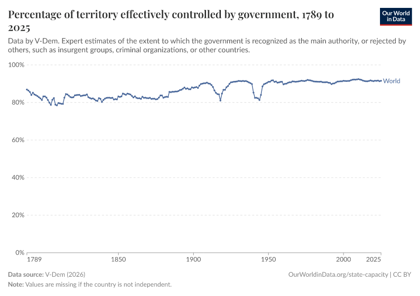 V-Dem (2025) – processed by Our World in Data. “Territory under state control – (central estimate)” [dataset]. V-Dem, “Democracy report v15” [original data]. Retrieved September 17, 2025 from https://search-refactor-react-query.owid.pages.dev/grapher/percentage-of-territory-controlled-by-government