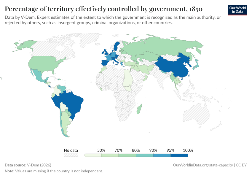 “Data Page: Territory under state control”, part of the following publication: Bastian Herre, Lucas Rodés-Guirao, and Esteban Ortiz-Ospina (2013) - “Democracy”. Data adapted from V-Dem. Retrieved from https://search-refactor-react-query.owid.pages.dev/grapher/percentage-of-territory-controlled-by-government [online resource]