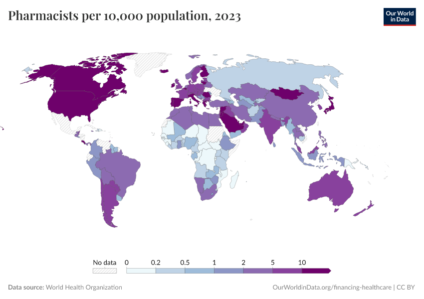 “Data Page: Pharmacists per 10,000 population”. Our World in Data (2025). Data adapted from World Health Organization. Retrieved from https://search-refactor-react-query.owid.pages.dev/grapher/pharmaceutical-personnel-per-1000 [online resource]How to cite this data