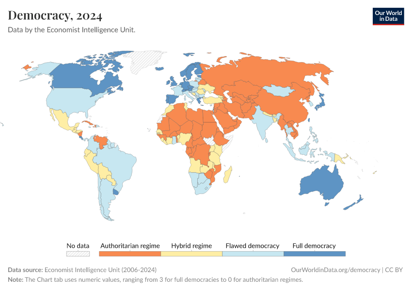 Economist Intelligence Unit (2006-2024) – processed by Our World in Data. “Political regime” [dataset]. Economist Intelligence Unit, “Democracy Index 2021: The China challenge”; Economist Intelligence Unit, “Democracy Index 2022: Frontline democracy and the battle for Ukraine”; Economist Intelligence Unit, “Democracy Index 2023: Age of Conflict”; Economist Intelligence Unit, “Democracy Index 2024: What's wrong with representative democracy?”; Gapminder, “Democracy Index v4” [original data]. Retrieved September 17, 2025 from https://search-refactor-react-query.owid.pages.dev/grapher/political-regime-eiu