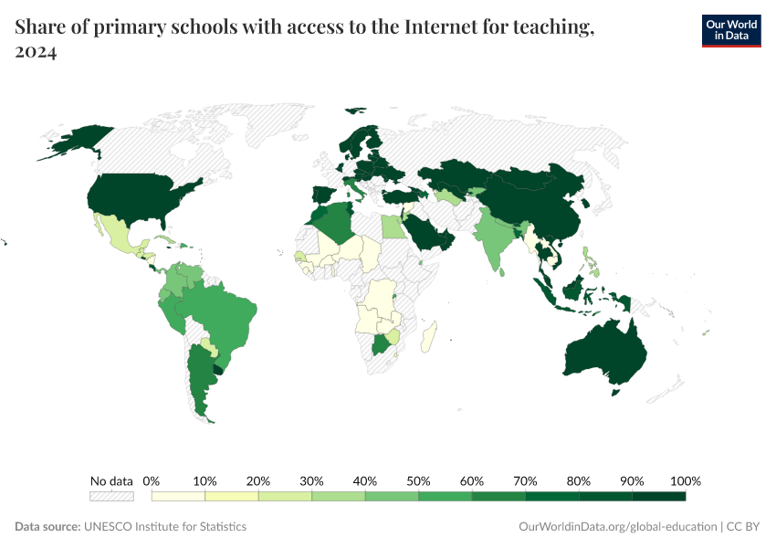 UNESCO Institute for Statistics – processed by Our World in Data. “Share of primary schools with access to the Internet for teaching” [dataset]. UNESCO Institute for Statistics, “Data from multiple sources” [original data]. Retrieved September 17, 2025 from https://search-refactor-react-query.owid.pages.dev/grapher/primary-schools-with-access-to-internet