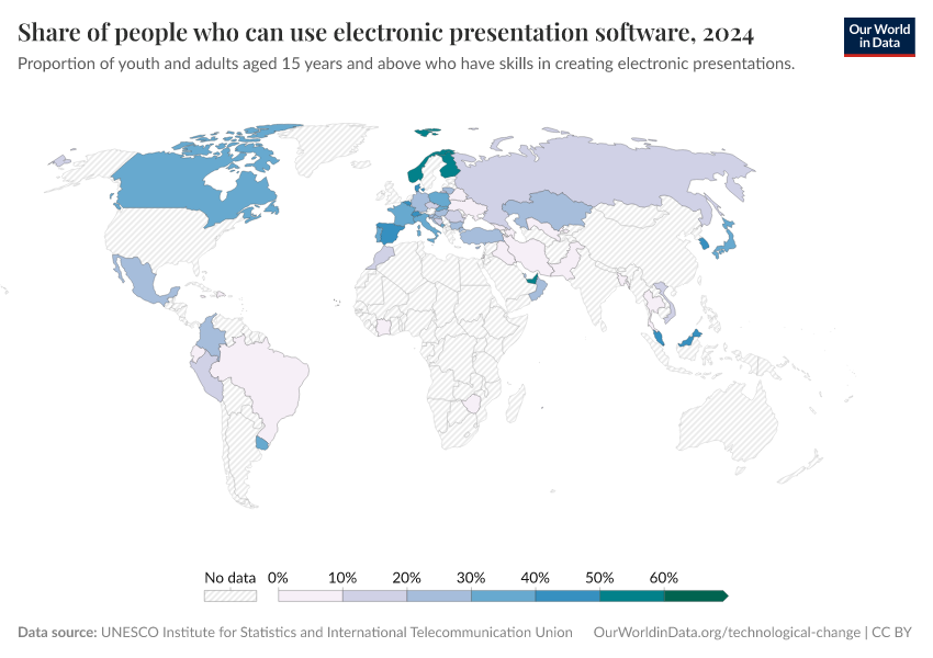“Data Page: Share of people who can use electronic presentation software”. Our World in Data (2025). Data adapted from International Telecommunication Union. Retrieved from https://search-refactor-react-query.owid.pages.dev/grapher/proportion-with-ict-skills-in-presentations [online resource]How to cite this data
