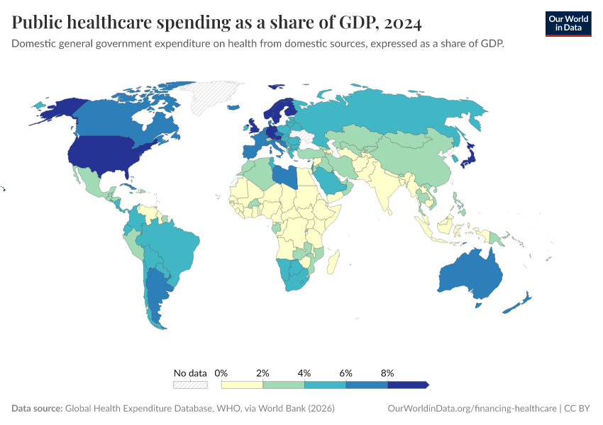 “Data Page: Public healthcare expenditure as a share of GDP”. Our World in Data (2025). Data adapted from World Health Organization Global Health Expenditure Database, via World Bank. Retrieved from https://search-refactor-react-query.owid.pages.dev/grapher/public-healthcare-spending-share-gdp [online resource]How to cite this data