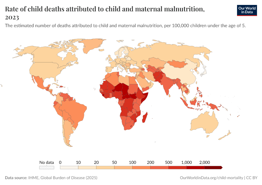 IHME, Global Burden of Disease (2024) – with minor processing by Our World in Data. “Rate of child deaths attributed to child and maternal malnutrition” [dataset]. IHME, Global Burden of Disease, “Global Burden of Disease - Risk Factors” [original data]. Retrieved September 17, 2025 from https://search-refactor-react-query.owid.pages.dev/grapher/rate-of-child-deaths-attributed-to-child-and-maternal-malnutrition