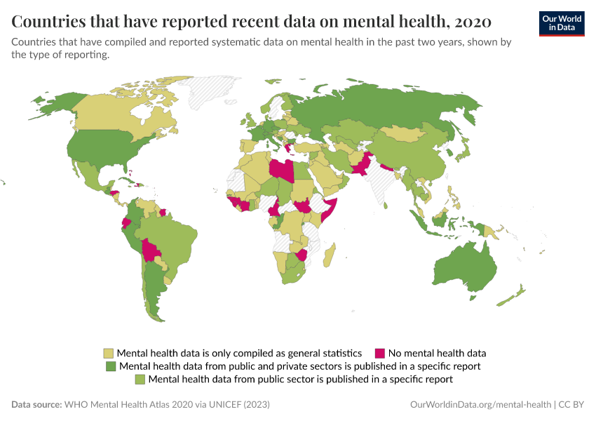 WHO Mental Health Atlas 2020 via UNICEF (2023) – with major processing by Our World in Data. “Countries that have reported recent data on mental health” [dataset]. WHO Mental Health Atlas 2020 via UNICEF, “Countdown for Global Mental Health 2030” [original data]. Retrieved September 17, 2025 from https://search-refactor-react-query.owid.pages.dev/grapher/reporting-of-mental-health-system-data-in-the-past-two-years