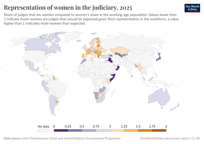 “Data Page: Representation of women in the judiciary”. Our World in Data (2025). Data adapted from Inter-Parliamentary Union. Retrieved from https://search-refactor-react-query.owid.pages.dev/grapher/representation-of-women-in-the-judiciary [online resource]How to cite this data