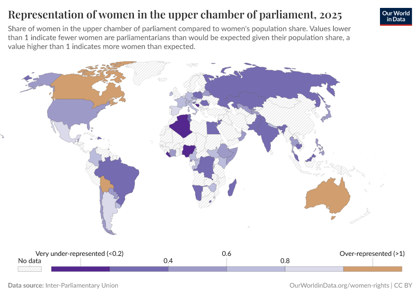 “Data Page: Representation of women in the upper chamber of parliament”. Our World in Data (2025). Data adapted from Inter-Parliamentary Union. Retrieved from https://search-refactor-react-query.owid.pages.dev/grapher/representation-of-women-in-the-upper-chamber-of-parliament [online resource]How to cite this data