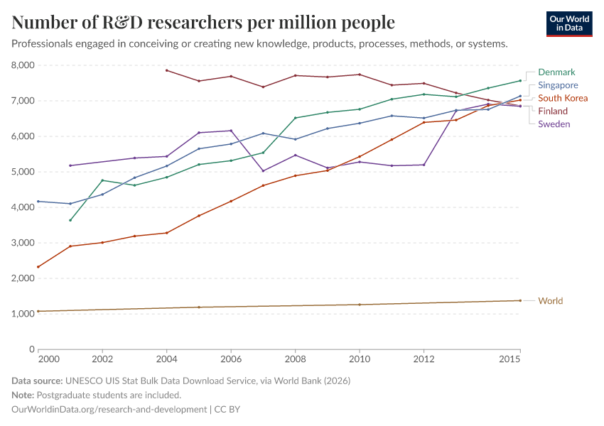“Data Page: Number of R&D researchers per million people”. Our World in Data (2025). Data adapted from UNESCO Institute for Statistics (UIS), via World Bank. Retrieved from https://search-refactor-react-query.owid.pages.dev/grapher/researchers-in-rd-per-million-people [online resource]How to cite this data