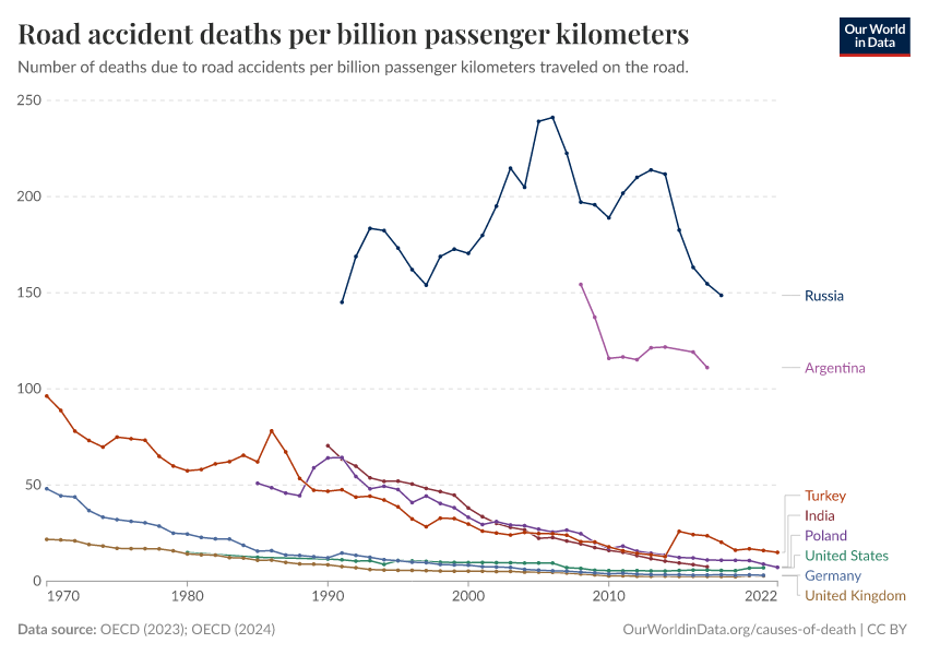 “Data Page: Road accident deaths per billion passenger kilometers”, part of the following publication: Hannah Ritchie and Max Roser (2021) - “Transport”. Data adapted from OECD. Retrieved from https://search-refactor-react-query.owid.pages.dev/grapher/road-accident-deaths-per-passenger-kilometers [online resource]How to cite this data