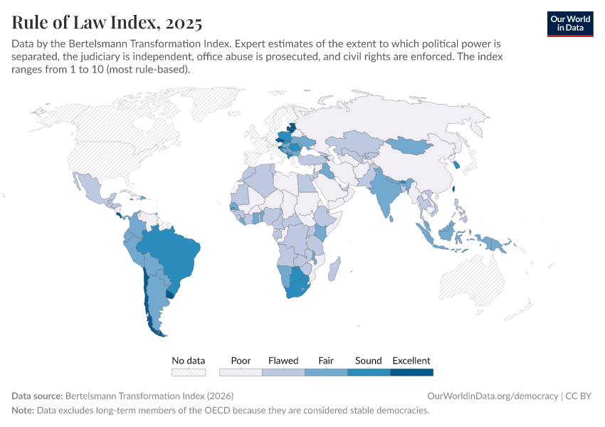 Bertelsmann Transformation Index (2024) – processed by Our World in Data. “Rule of law index” [dataset]. Bertelsmann Transformation Index, “Bertelsmann Transformation Index, Scores” [original data]. Retrieved September 17, 2025 from https://search-refactor-react-query.owid.pages.dev/grapher/rule-of-law-index-bti