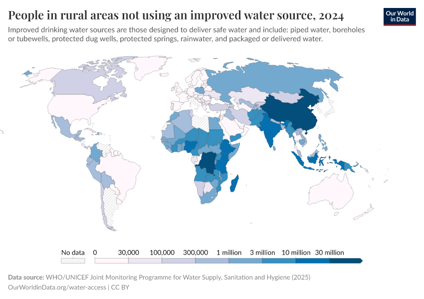 WHO/UNICEF Joint Monitoring Programme for Water Supply, Sanitation and Hygiene (JMP) (2024) – with major processing by Our World in Data. “People in rural areas not using an improved water source” [dataset]. WHO/UNICEF Joint Monitoring Programme for Water Supply, Sanitation and Hygiene (JMP), “WHO/UNICEF Joint Monitoring Programme for Water Supply, Sanitation and Hygiene (JMP) - Households”; WHO/UNICEF Joint Monitoring Programme for Water Supply, Sanitation and Hygiene (JMP), “WHO/UNICEF Joint Monitoring Programme for Water Supply, Sanitation and Hygiene (JMP) - Households - Regions” [original data]. Retrieved September 17, 2025 from https://search-refactor-react-query.owid.pages.dev/grapher/rural-without-improved-water