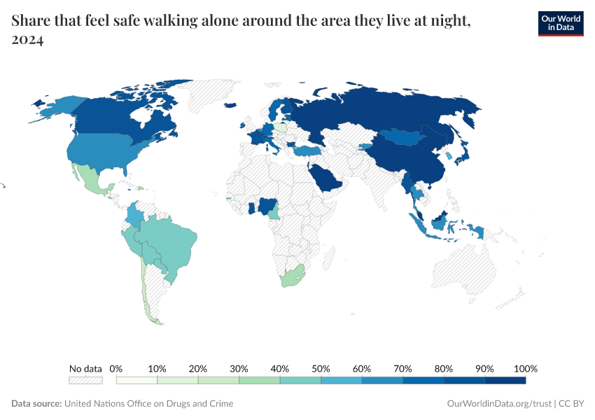 “Data Page: Share that feel safe walking alone around the area they live at night”. Our World in Data (2025). Data adapted from United Nations Office on Drugs and Crime. Retrieved from https://search-refactor-react-query.owid.pages.dev/grapher/safety-walking-alone [online resource]How to cite this data