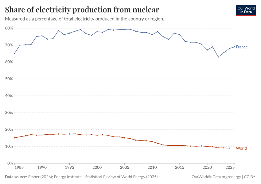 “Data Page: Share of electricity generated by nuclear power”, part of the following publication: Hannah Ritchie, Pablo Rosado, and Max Roser (2023) - “Energy”. Data adapted from Ember, Energy Institute. Retrieved from https://search-refactor-react-query.owid.pages.dev/grapher/share-electricity-nuclear [online resource]How to cite this data