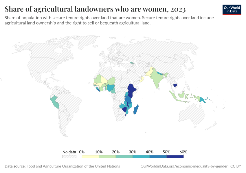 Food and Agriculture Organization of the United Nations – processed by Our World in Data. “Share of agricultural landowners who are women” [dataset]. Food and Agriculture Organization of the United Nations, “Data from multiple sources” [original data]. Retrieved September 17, 2025 from https://search-refactor-react-query.owid.pages.dev/grapher/share-of-agricultural-land-owners-that-are-women