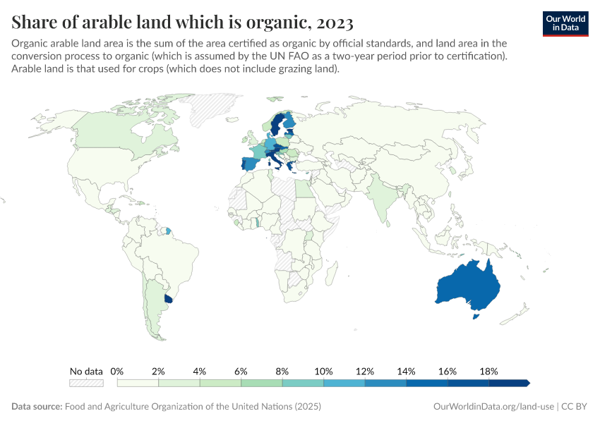 Food and Agriculture Organization of the United Nations (2024) – with major processing by Our World in Data. “Share of arable land that is organic – UN FAO” [dataset]. Food and Agriculture Organization of the United Nations, “Land, Inputs and Sustainability: Land Use” [original data]. Retrieved September 17, 2025 from https://search-refactor-react-query.owid.pages.dev/grapher/share-of-arable-land-which-is-organic
