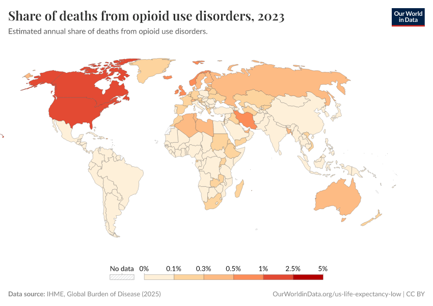 IHME, Global Burden of Disease (2024) – with minor processing by Our World in Data. “Share of deaths from opioid use disorders” [dataset]. IHME, Global Burden of Disease, “Global Burden of Disease - Deaths and DALYs” [original data]. Retrieved September 17, 2025 from https://search-refactor-react-query.owid.pages.dev/grapher/share-of-deaths-from-opioid-overdoses