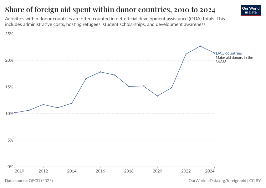 OECD (2025) – with minor processing by Our World in Data. “ODA by donor - In-donor aid (% of ODA) – Net disbursements” [dataset]. OECD, “OECD Official Development Assistance (ODA) - DAC1: Flows by provider (ODA+OOF+Private)” [original data]. Retrieved September 17, 2025 from https://search-refactor-react-query.owid.pages.dev/grapher/share-of-foreign-aid-spent-within-donor-countries
