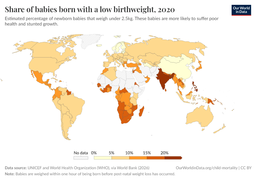 “Data Page: Share of babies born with a low birthweight”. Our World in Data (2025). Data adapted from UNICEF and World Health Organization, via World Bank. Retrieved from https://search-refactor-react-query.owid.pages.dev/grapher/share-of-low-birthweight-babies-born [online resource]How to cite this data
