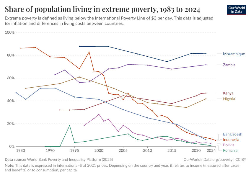 World Bank Poverty and Inequality Platform (2024) – with major processing by Our World in Data. “Share of population living in extreme poverty – World Bank” [dataset]. World Bank Poverty and Inequality Platform, “World Bank Poverty and Inequality Platform (PIP) 20240627_2017, 20240627_2011” [original data]. Retrieved September 17, 2025 from https://search-refactor-react-query.owid.pages.dev/grapher/share-of-population-in-extreme-poverty
