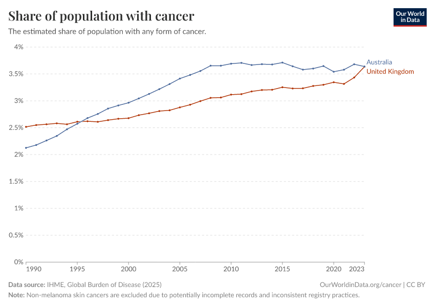 IHME, Global Burden of Disease (2024) – with major processing by Our World in Data. “Share of population with cancer” [dataset]. IHME, Global Burden of Disease, “Global Burden of Disease - Prevalence and Incidence” [original data]. Retrieved September 17, 2025 from https://search-refactor-react-query.owid.pages.dev/grapher/share-of-population-with-cancer-crude