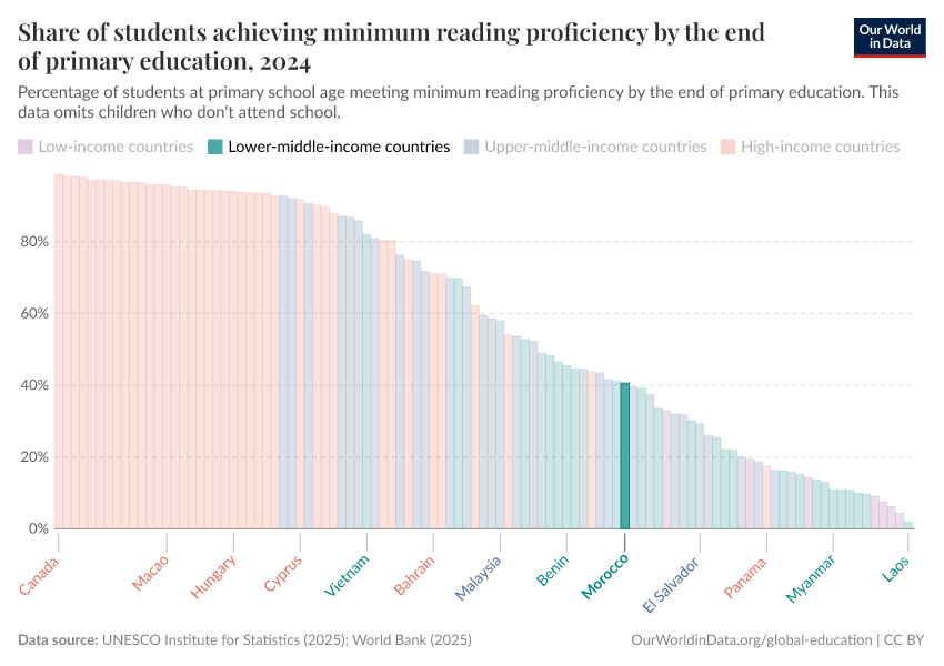“Data Page: Share of students achieving minimum reading proficiency by the end of primary education”. Our World in Data (2025). Data adapted from UNESCO Institute for Statistics. Retrieved from https://search-refactor-react-query.owid.pages.dev/grapher/share-of-students-at-end-of-primary-education-achieving-minimum-reading-proficiency [online resource]How to cite this data