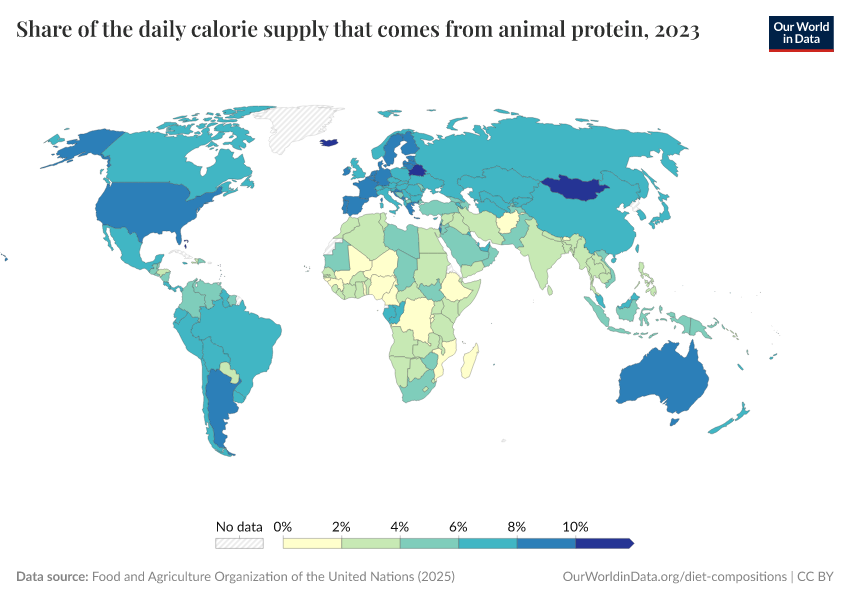 “Data Page: Share of the daily calorie supply that comes from animal protein”, part of the following publication: Hannah Ritchie, Pablo Rosado, and Max Roser (2023) - “Agricultural Production”. Data adapted from Food and Agriculture Organization of the United Nations. Retrieved from https://search-refactor-react-query.owid.pages.dev/grapher/share-of-the-daily-calorie-supply-that-comes-from-animal-protein [online resource]How to cite this data