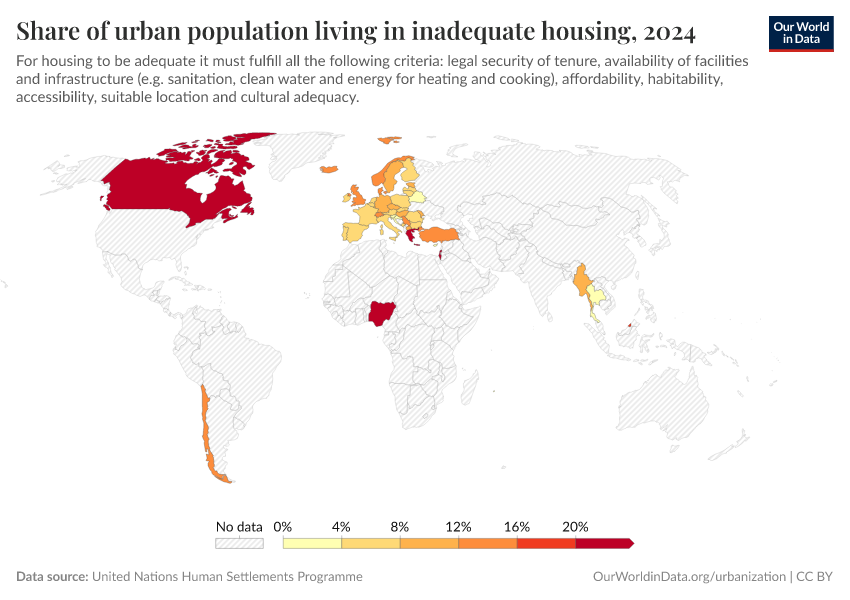 “Data Page: Share of urban population living in inadequate housing”. Our World in Data (2025). Data adapted from United Nations Human Settlements Programme. Retrieved from https://search-refactor-react-query.owid.pages.dev/grapher/share-of-urban-population-living-in-inadequate-housing [online resource]How to cite this data