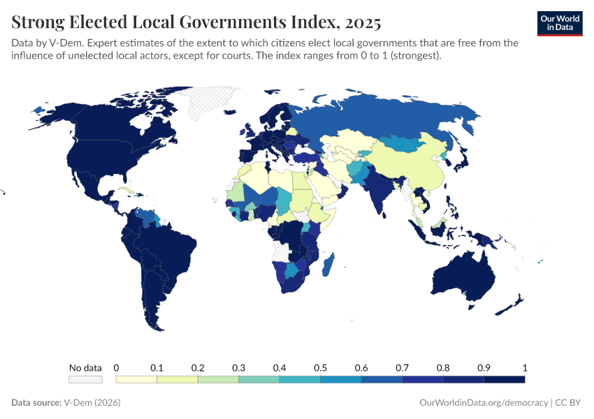 “Data Page: Elected local governments”, part of the following publication: Bastian Herre, Lucas Rodés-Guirao, and Esteban Ortiz-Ospina (2013) - “Democracy”. Data adapted from V-Dem. Retrieved from https://search-refactor-react-query.owid.pages.dev/grapher/strong-elected-local-governments-index [online resource]How to cite this data