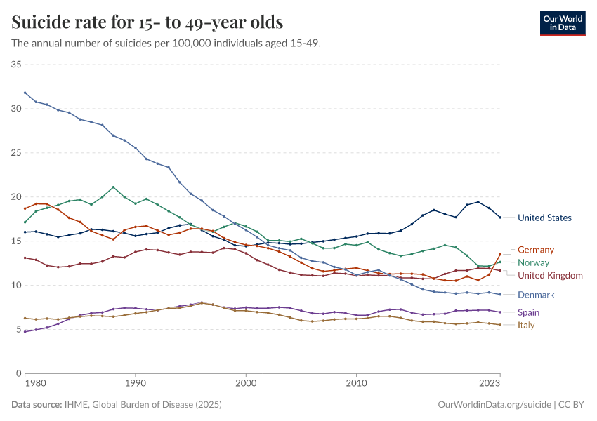 IHME, Global Burden of Disease (2024) – with minor processing by Our World in Data. “Suicide rate for 15- to 49-year olds” [dataset]. IHME, Global Burden of Disease, “Global Burden of Disease - Deaths and DALYs” [original data]. Retrieved September 17, 2025 from https://search-refactor-react-query.owid.pages.dev/grapher/suicide-rate-for-15--to-49-year-olds