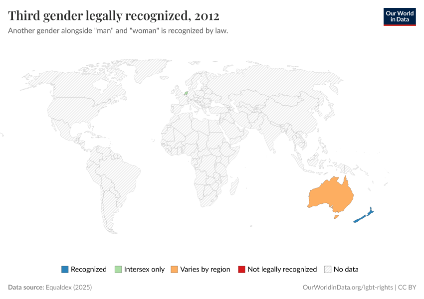 “Data Page: Third gender legally recognized”, part of the following publication: Bastian Herre and Pablo Arriagada (2023) - “LGBT+ Rights”. Data adapted from Equaldex. Retrieved from https://search-refactor-react-query.owid.pages.dev/grapher/third-gender-recognition-equaldex [online resource]