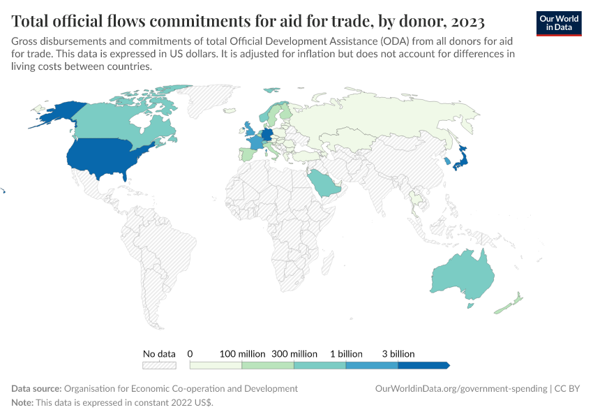 Organisation for Economic Co-operation and Development – processed by Our World in Data. “Total official flows commitments for aid for trade, by donor” [dataset]. Organisation for Economic Co-operation and Development, “The Organisation for Economic Co-operation and Development (OECD).” [original data]. Retrieved September 17, 2025 from https://search-refactor-react-query.owid.pages.dev/grapher/total-oda-for-aid-for-trade-by-donor